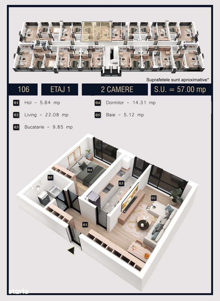 Apartamentul de 2 camere open space, cu o suprafață de 57 mp, oferă un echilibru perfect între funcționalitate și estetică modernă. Zona de zi este amplă și aerisită, integrând livingul și bucătăria într-un spațiu deschis, ideal pentru un stil de viață dinamic. Ferestrele panoramice mari creează o conexiune naturală cu exteriorul, iar fațada ventilată premium, încălzirea prin pardoseală automatizată și materialele de calitate superioară asigură confort pe termen lung.