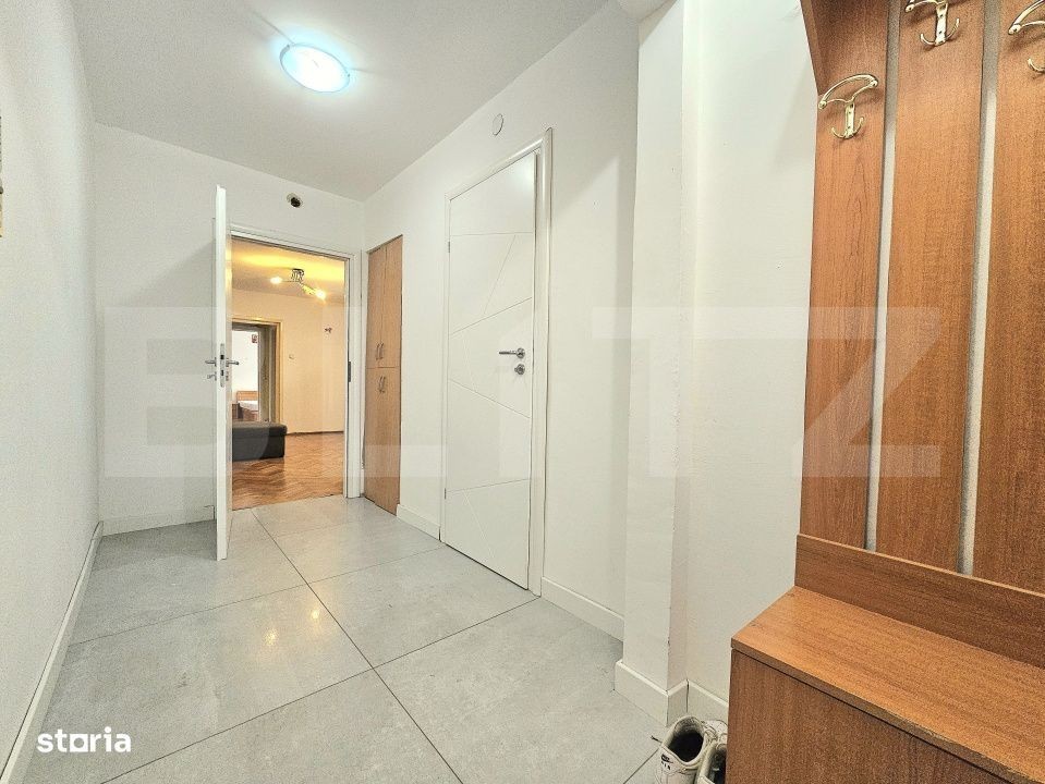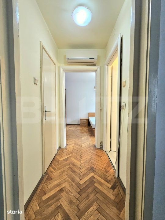 Blitz va prezinta pentru inchiriere un apartament cu 2 camere, semidecomandat, amplasat la etajul 2 al unui imobil cu regim de inaltime P+4. Imobilul este dotat cu sistem de aer conditionat, incalzire centralizata prin Colterm, costuri reduse de intretinere si a fost renovat partial. Compartimentarea este functionala si cuprinde: hol de acces spatios, bucatarie separata complet utilata, prevazuta cu debara, living generos cu acces direct catre balcon, antreu cu spatiu de depozitare, din care se face accesul catre baia echipata cu vana si dormitor luminos. Proprietatea este situata intr-o zona rezidentiala linistita, cu acces facil catre centrul orasului, aflat la aproximativ 15 minute de mers pe jos. Daca v-am atras atentia va asteptam la vizionare.