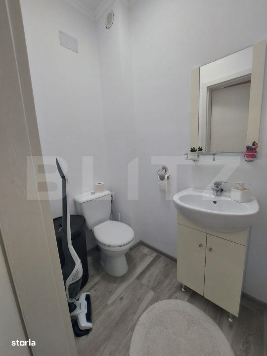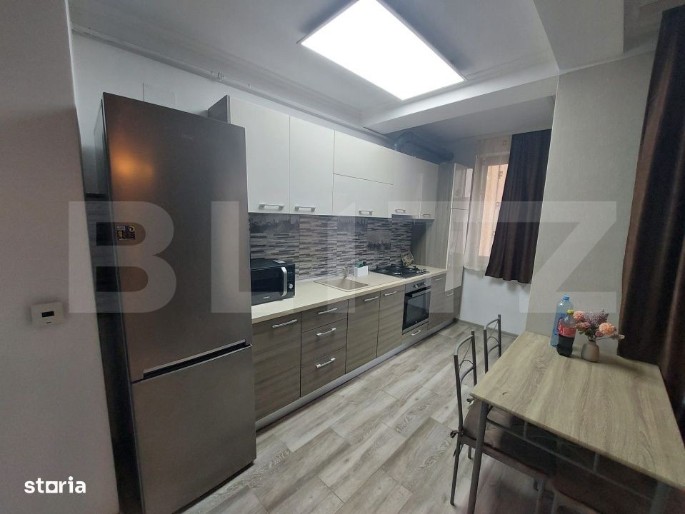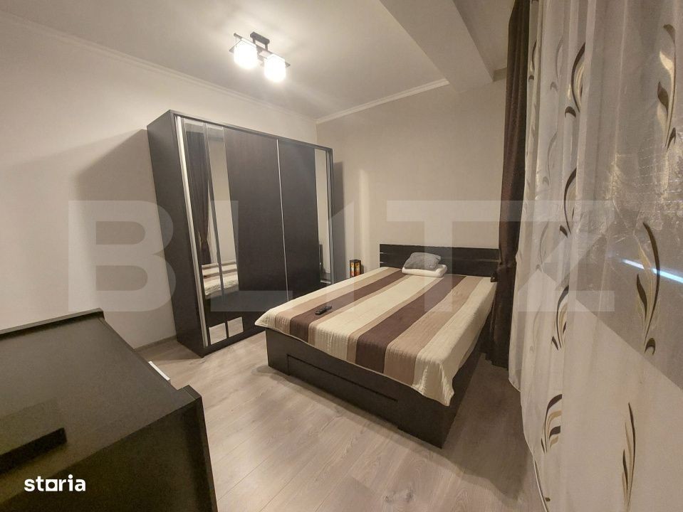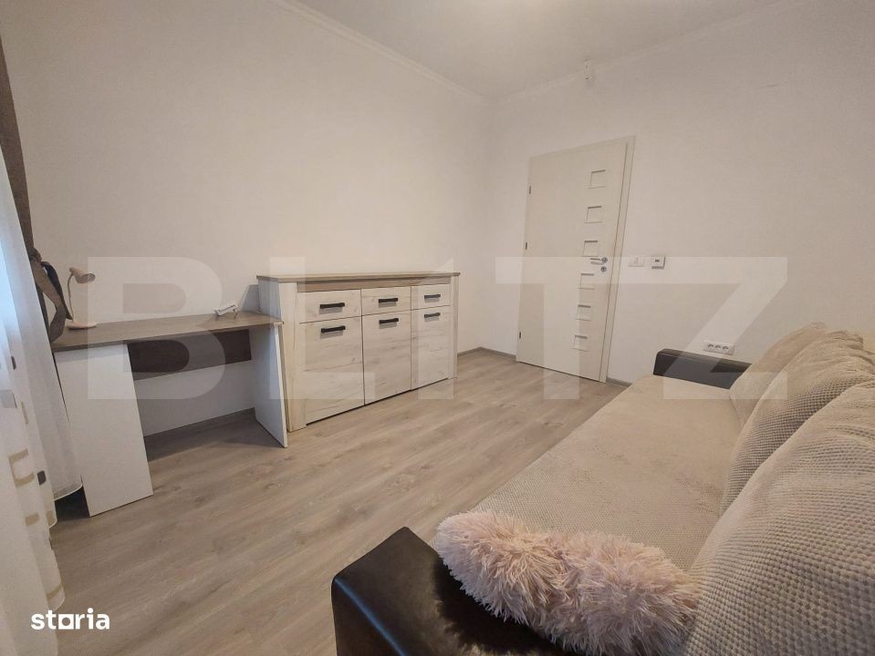 Se oferă spre închiriere apartament de 3 camere, 66 mp utili, situat la etajul 1 într-un bloc finalizat în 2017. Compartimentare practică cu două dormitoare, baie principală și baie de serviciu. Dotări: încălzire în pardoseală cu 3 termostate, centrală proprie, aer condiționat 12.000 BTU, interfon video, alarmă, rulouri de aluminiu, canapea extensibilă. Loc de parcare inclus. Prima închiriere. Preț: 500€/lună, ușor negociabil. Garanție: 500€. Contract înregistrat la ANAF.
