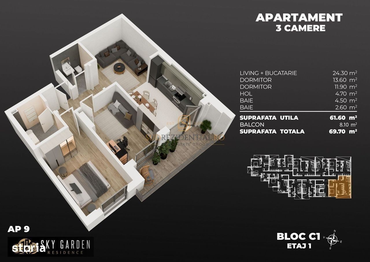 Apartamentul cu 3 camere, situat la etajul 1 al Blocului C1 din cadrul proiectului Sky Garden Residence, impresioneaza prin spatii generoase, compartimentare eficienta si finisaje moderne. Suprafata totala este de 73.30 mp, din care 66.10 mp utili si doua balcoane cu suprafete de 4.20 mp si 3.00 mp. Spatiul interior este bine optimizat si luminos, fiind compus din: - Living: 19.10 mp - Dormitor 1: 12.35 mp - Dormitor 2: 10.35 mp - Bucatarie separata: 7.70 mp - Baie: 4.55 mp - Grup sanitar: 2.90 mp - Hol + dressing: 9.15 mp Locuinta beneficiaza de incalzire prin pardoseala, centrala termica proprie, tamplarie PVC cu geam tripan 4 anotimpuri, balcoane inchise cu sticla securizata si fatade ventilate cu finisaje din Alucobond. Finisajele interioare sunt moderne si pot fi personalizate in functie de preferintele viitorului proprietar. Imobilul dispune de lift performant, videointerfon, spatii comune elegante si posibilitatea achizitionarii de locuri de parcare subterane si supraterane. Proiectul Sky Garden Residence - Faza a II-a, este amplasat pe Strada Popesti Vest, in Orasul Popesti-Leordeni, Ilfov, laga pasarela pietonala catre statia de metrou Berceni, intr-o zona cu infrastructura moderna - drumuri asfaltate, trotuare iluminate si acces facil catre centrul Capitalei. In imediata apropiere se regasesc: - Centre comerciale importante: Penny, Mega Image, Profi, Auchan, Mall La Strada - Unitati de invatamant, clinici, farmacii, banci - Zone verzi si de agrement: Parcul Copiilor (Drumul Fermei) si Parcul Tudor Arghezi (Bd. Metalurgiei) Ansamblul este dispus intr-o zona comerciala extinsa, cu promenada pietonala, hipermarket, magazine, farmacii, cafenele si gradinita privata, definind un adevarat concept modern dedicat confortului zilnic. In pretul afisat nu este inclusa cota de TVA.